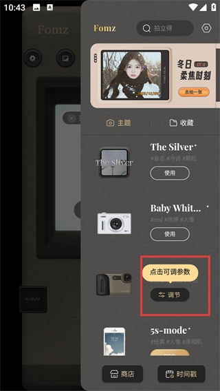 选择主题后,点击它下方的【调节】按钮,即可打开该主题对应的参数调整面板,进而自定义拍摄效果。