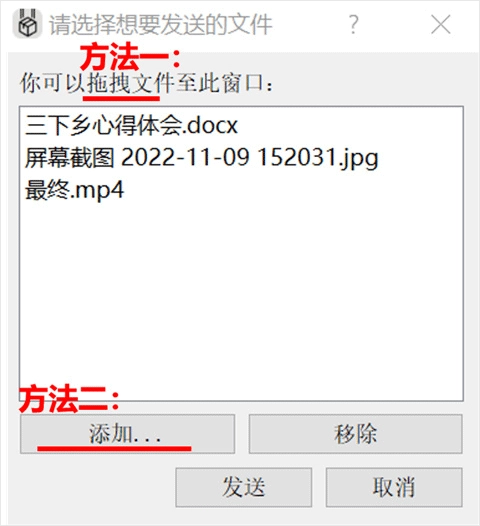 1、首先在电脑端,我们可以把要发送的文件拖到窗口里,或者点击左下角的“添加”按钮,之后再点击“发送”;