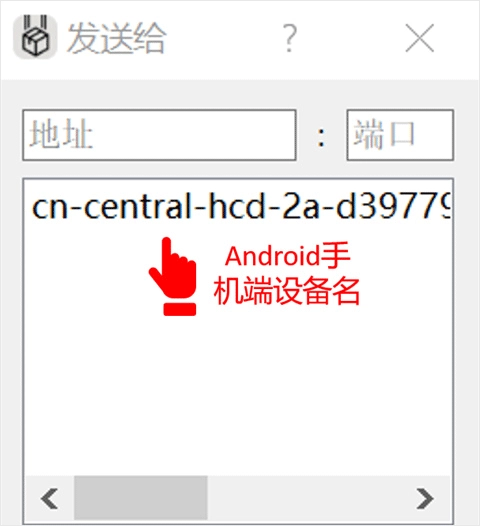 2、当两个设备的软件都处于打开状态时,电脑端会显示如下界面。请选择“传送设备的名称”,然后点击发送按钮。