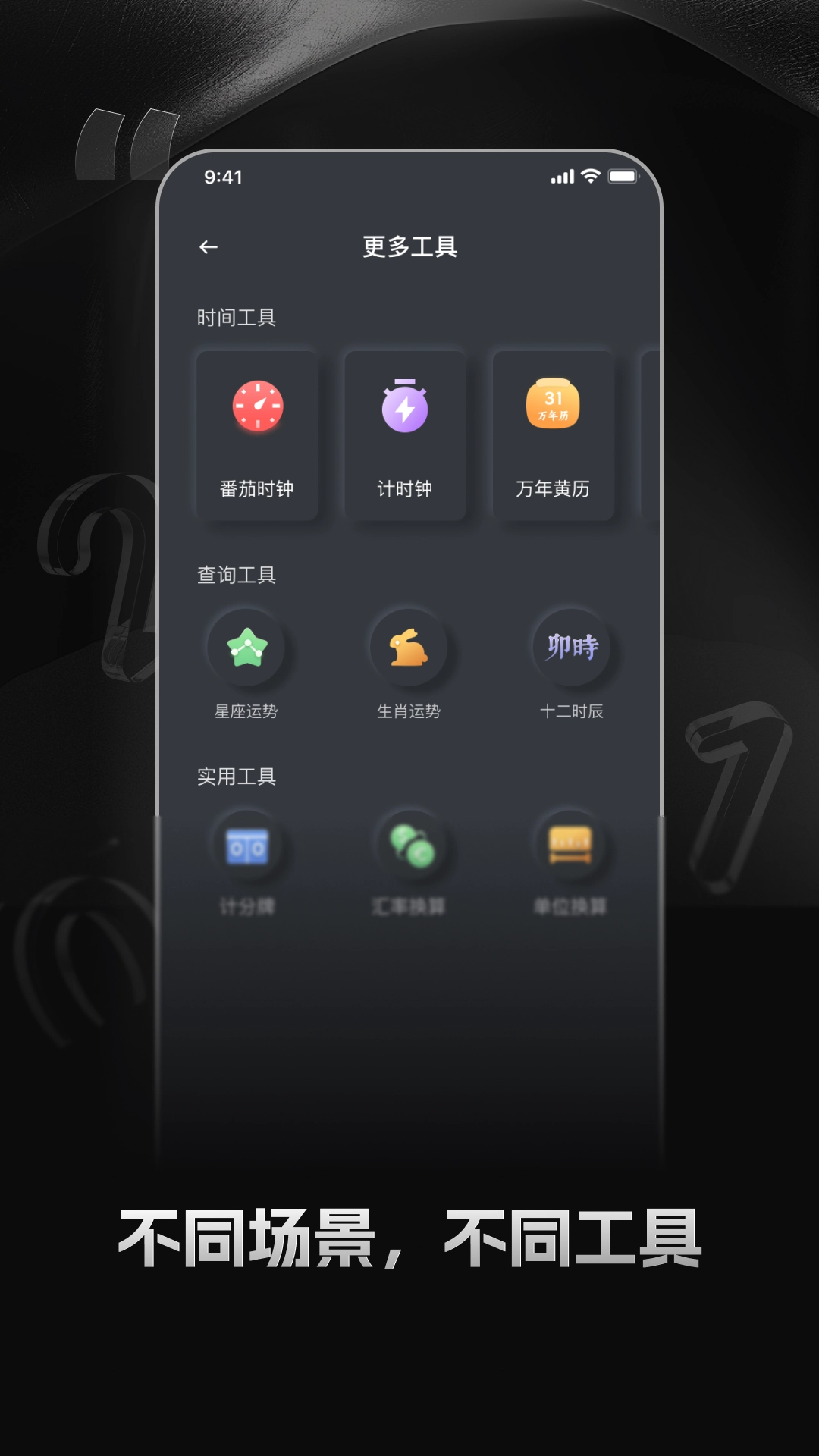 在更多工具里,你可以找到番茄时钟、计时钟、万年黄历,还有查询工具和实用工具。