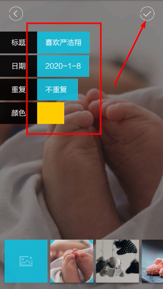 3、进入事件编辑页面后,依次填写标题、日期、重复规则并选定颜色,之后点击右上角的确认按钮,即可完成事件的创建。