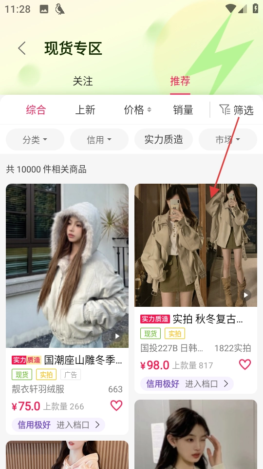 在购物类应用的首页中,找到并点击“现货专区”的入口,即可进入展示现货商品的列表页面。