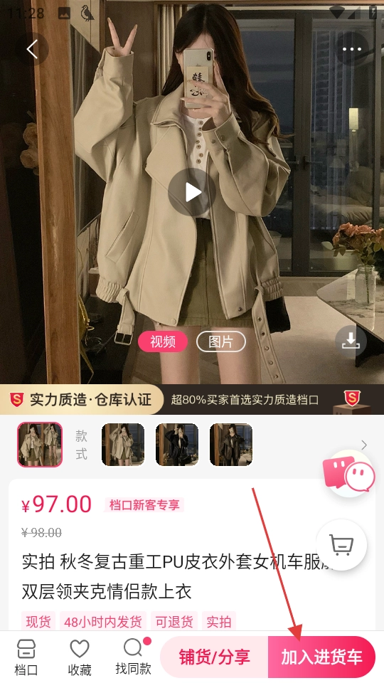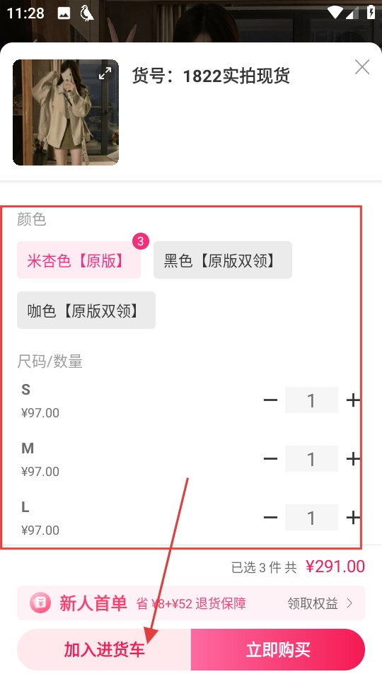 在商品规格选择页面完成选择后,点击“加入进货车”按钮,就能把商品添加到进货车里。