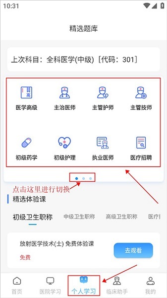 1、在底部找到“个人学习”板块,接着可依据自身需求,从“医学高级”“主治医师”“主管护师”“主管技师”,或是“初级药学”“初级护理”“执业医师”等科目里进行选择。