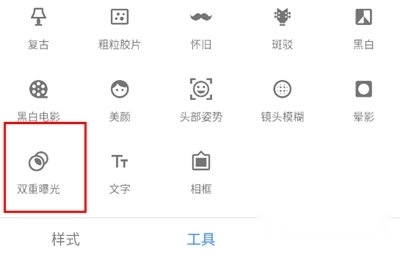 若想在snapseed里保留图片的局部色彩,步骤如下:先导入一张原图,接着在工具栏中找到并选择【双重曝光】功能。