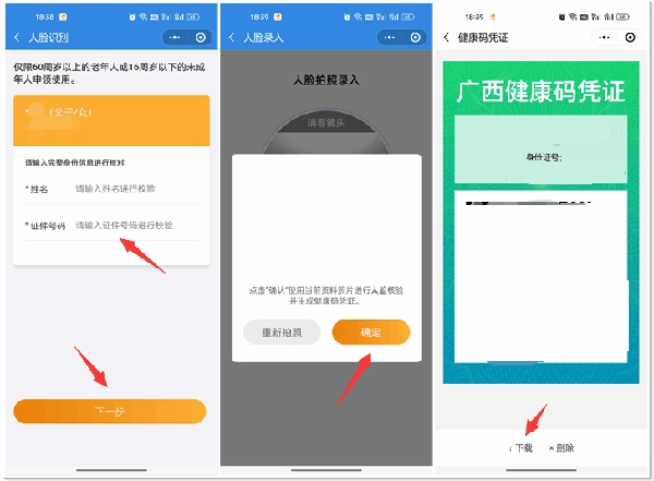 2、在输入孩子或老人的姓名与身份证号码后,点击【下一步】按钮,随后进行人脸拍照录入。由于拍摄的头像后续会用于打印,因此建议选择白色背景,并且尽量拍摄得清晰美观一些。若对拍摄效果不满意,可以重新拍摄,直至满意后点击【确定】按钮,即可成功申领广西健康码凭证。