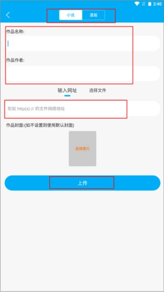 2、这里包含小说和漫画两个页面,在小说界面中输入作品名称、作品作者、文件网络地址、最后点击上传即可。