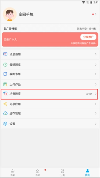 1、同样还是在笔趣阁【我的】,这次要点击上方的“求书进度”。