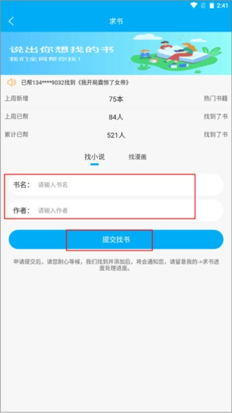 3、输入书名和作者,最后点击提交找书按钮就可以了。