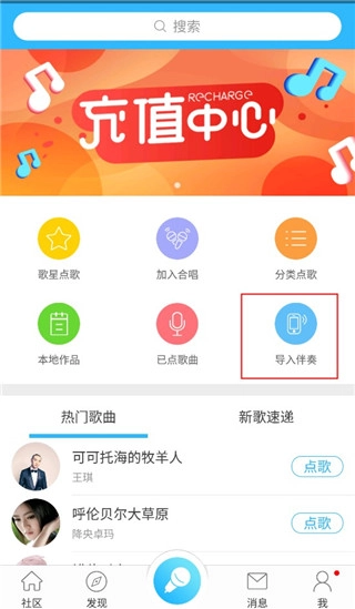 1、启动软件后,进入“K歌”界面,找到并点击“导入伴奏”按钮;
