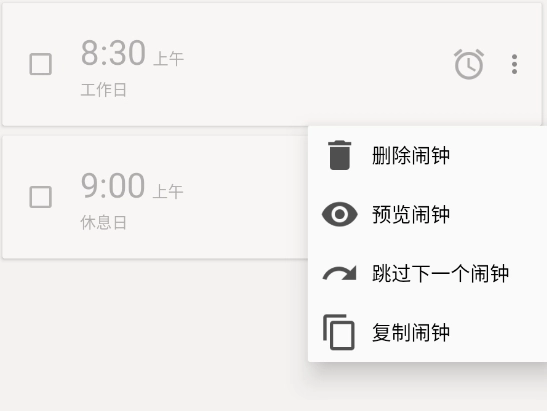 6、闹钟设置完成后,点击闹钟旁的菜单即可对闹钟进行修改或删除操作。