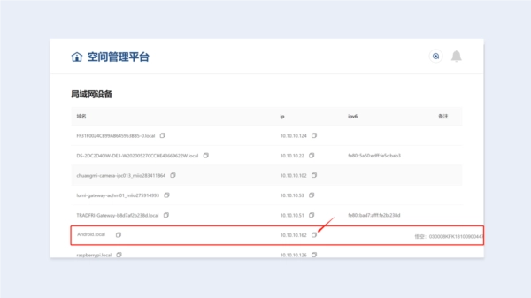 2、此页面显示的是与空间内互联中枢在同一局域网的设备,悟空机器人会在备注栏显示相应的序列号。我们通过序列号找到该悟空设备,点击复制该设备的「ip」。