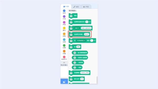 1、找到积木「连接悟空机器人(00447)」,在白色圆角矩形输入框中输入您手边的悟空机器人书包底下序列号的后四位。输入后点击该积木。