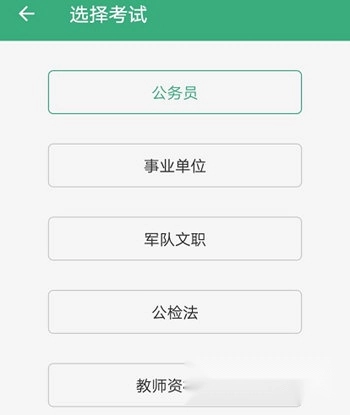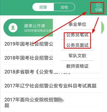 1、打开腰果公考,点击右上角的“切换”按钮,随后选择公务员笔试或公务员面试。