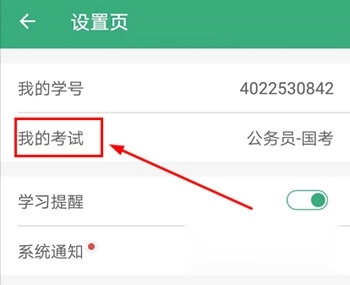 2、接着在个人信息设置页面里,找到并点击“我的考试”功能选项。