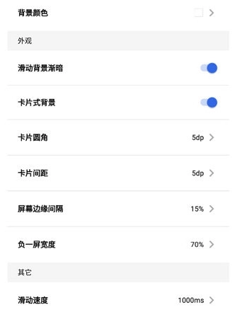 6、支持基本显示内容设置、操作相关设置、界面设置,以及开启前的通知设置、横屏自动关闭、点击应用图标行为、黑名单等功能,还可调节图标大小。