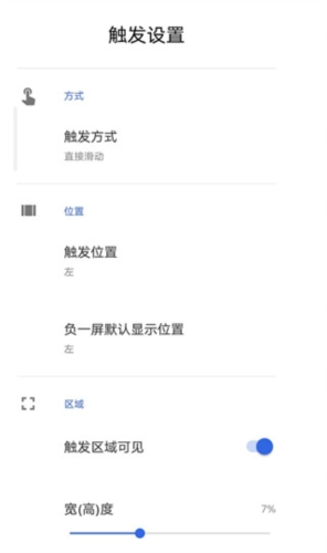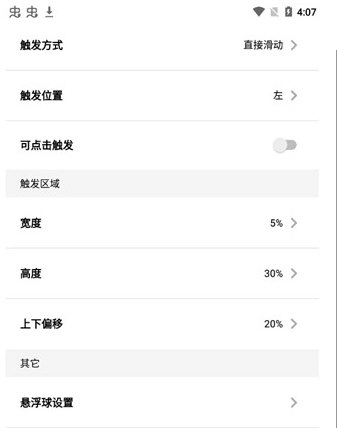 2、回到应用里,能够设置触发的位置、区域、悬浮球这些选项,还可以调整主题外观,像背景、动画、图标包之类的,这些就由小伙伴们自己尝试着设置啦。