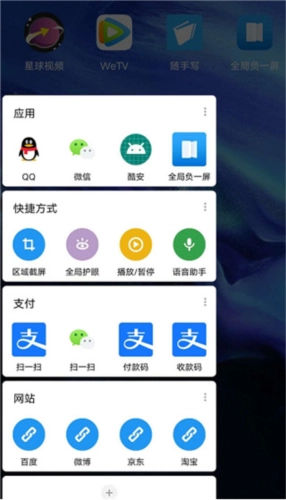 3、开启全局负一屏后,桌面会出现一个小区域的悬浮按钮,点击该按钮就能打开全局负一屏的菜单信息栏,其中包含应用、快捷方式、支付、网站4个栏目。支付功能目前仅支持微信和支付宝的快捷支付方式,使用时直接点击即可快速进入付款界面,无需逐步打开应用程序操作,十分便捷。