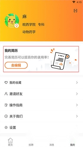 2、点击我的界面上方的“我的简历”选项。