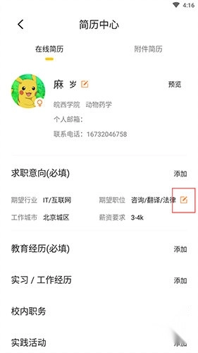 6、保存成功后,简历即成功上传,点击简历右侧的编辑选项即可对简历进行修改。