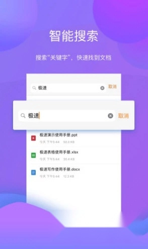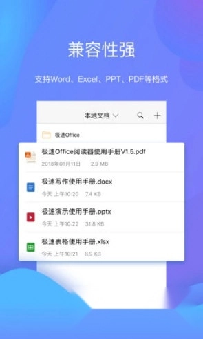 极速Office是一款便捷高效、干扰的办公平台,能够支持极速写作、极速表格、极速演示的创建、编辑与阅读功能;它全面兼容微软Office 97至2016版本的各类格式,包括Word的docx、doc,Excel的xlsx、xls,PPT的pptx、ppt等;还支持一键将文件另存为PDF、TXT等常用格式以便阅读;PDF渲染引擎,可直接打开并阅读PDF文档;其界面设计简洁大方,操作方式简单易懂,是一款极简风格的办公软件;同时,它致力于重新定义下一代办公体验,为用户打造真正省心、具备实用价值的高效办公平台。