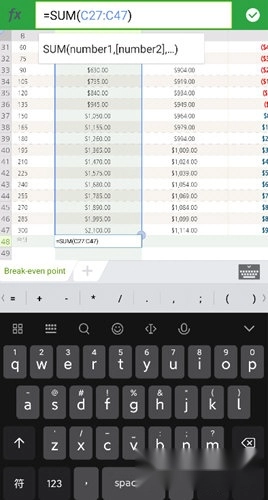 3、在页面上方的fx文本框里输入求和公式:=SUM(number1,number2)。