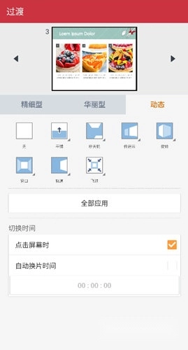 3、当前可选用的动态样式包括平铺、摩天轮、传送带、旋转、窗口、轨道、飞过,接着选择方向与切换时间,点击“全部应用”按钮即可完成设置。