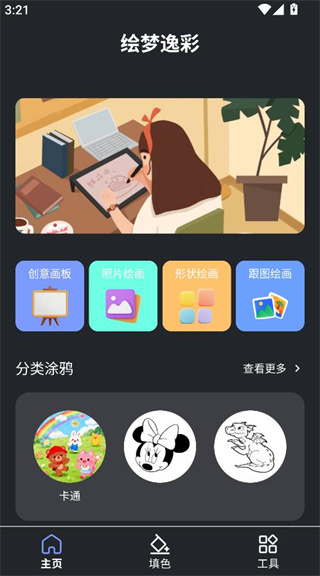 绘梦逸彩这款产品以创意绘画为核心功能,集成了多种绘画模式与辅助工具,既能满足用户日常绘画创作的需求,也提供离线涂鸦、工具查询等便捷服务,可适配不同的使用场景。它的绘画模式十分丰富,除了基础的创意画板外,还有照片绘画、形状绘画、分类涂鸦等特色模式,并且支持卡通、水果、数字、字母等不同主题的创作,能够充分满足用户的个性化绘画需求。