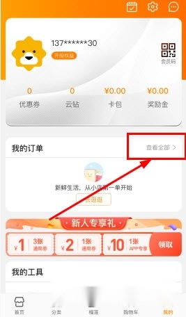 2、在个人中心页面,我们点击“我的订单”右侧的“查看全部”按钮。