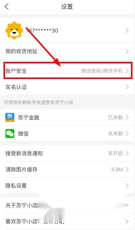 1、我们打开苏宁小店,进入个人中心页面,点击该界面右上角的按钮进入“设置”界面,然后在设置界面中选择“账户安全”选项。