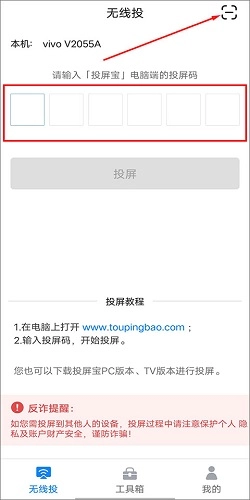 2、接着我们打开投屏宝,在其中输入之前获取的投屏码,或者通过扫描功能扫描对应的二维码,随后点击投屏按钮就可以了。