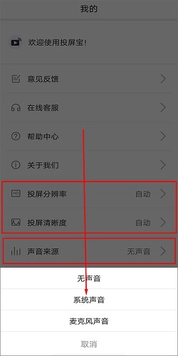 3、若投屏宝投屏过程中出现无声音的情况,您可进入“我的”页面,找到“声音来源”选项,选择系统声音或麦克风声音来解决。
