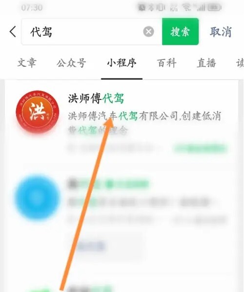 打开手机的微信,输入并点击洪师傅代驾。