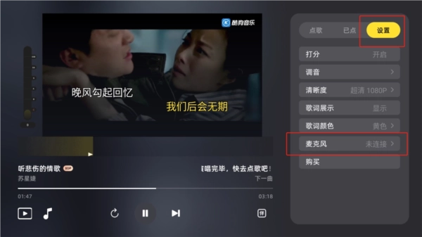 连接好后,就可以在MV播放页面中,选择设置,然后就可以看到麦克风的连接情况。