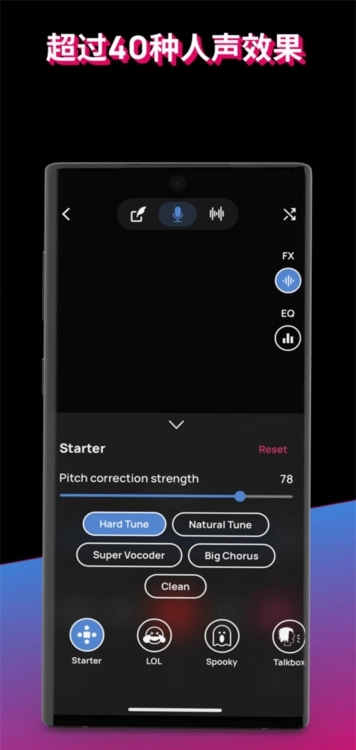 40+种人声特效实时渲染:从「8位芯片」复古游戏音效到「外星人」科幻变声,涵盖幽默、电子、古典等12大类别,支持多层效果叠加,单次录音可同时应用3种不同特效。