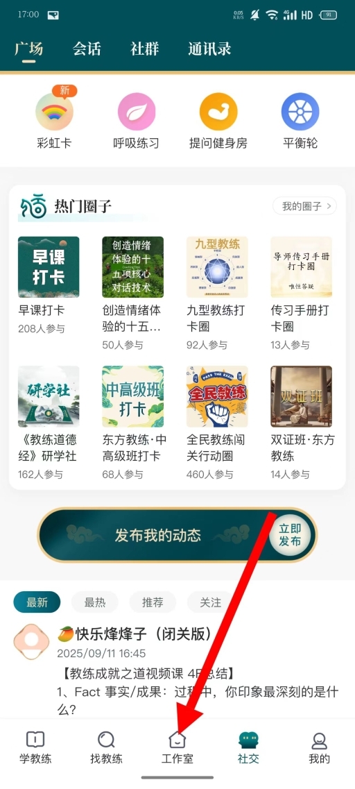 4、进入工作室页面后,可查看教练文化学习内容、活动日历等相关信息,进而开展教练文化学习及教练对话能力训练。