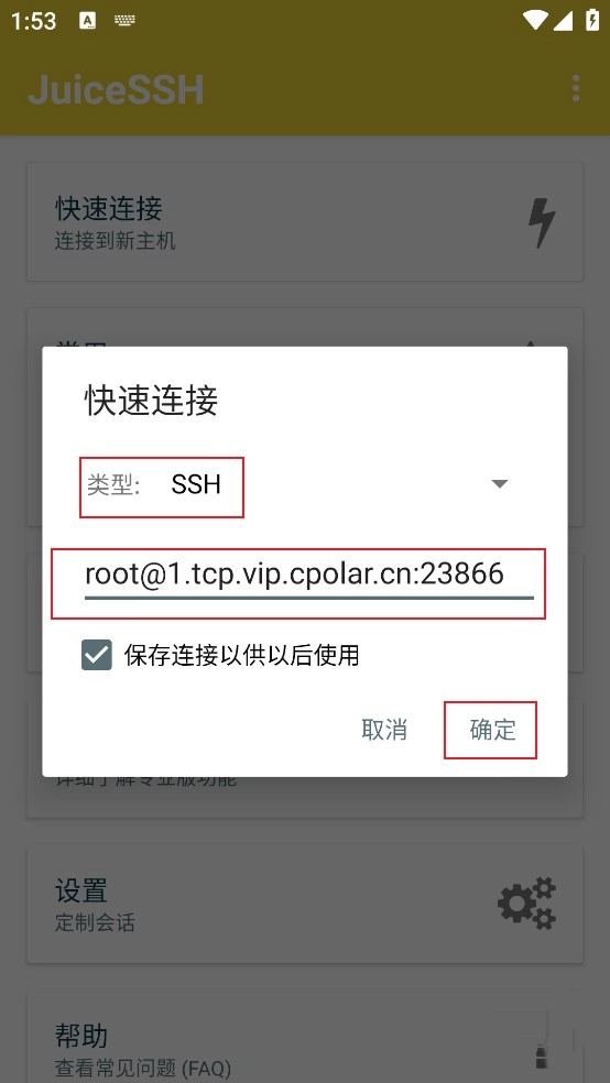 2、进入快速连接界面后,填入之前生成的cpolar公网地址。需要注意的是,填写格式必须是“用户名@cpolar地址”,确认输入无误后点击“确定”按钮。