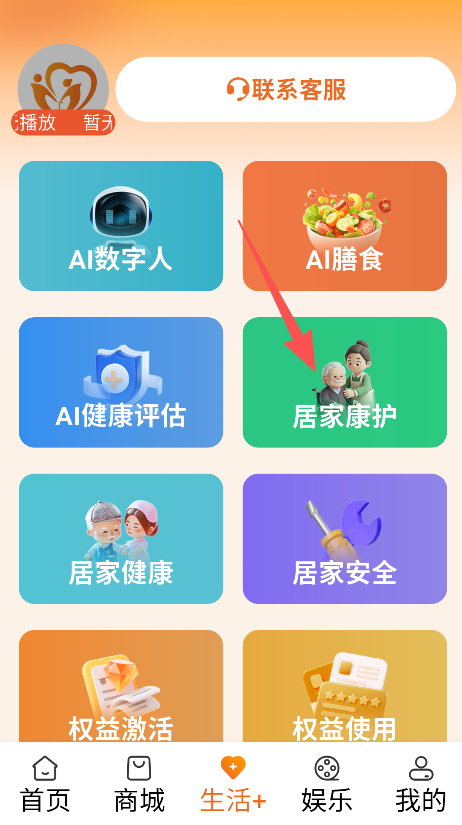 1、模块入口设计直观清晰,AI数字人、居家康护等板块分类明确,用户可快速进入对应服务板块,操作流程高效便捷,能有效节省用户时间。