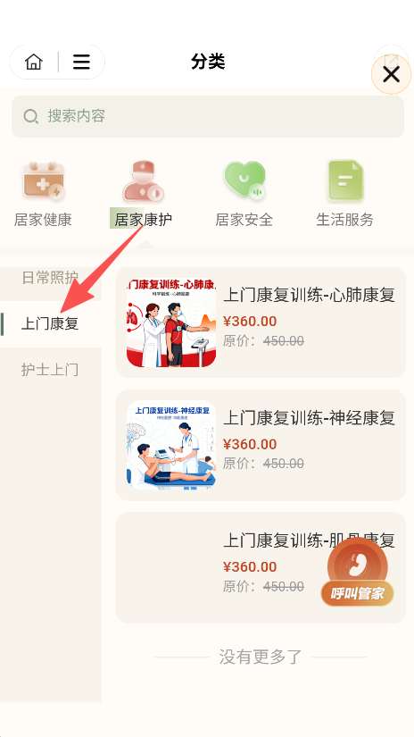2、选择上门康复分类,查看目标服务。