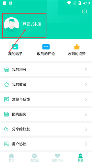 2、进入个人中心后,点击【登录/注册】板块,即可启动登录流程;登录完成后,就能使用平台的所有功能,比如查看收到的评论、点赞等互动信息。