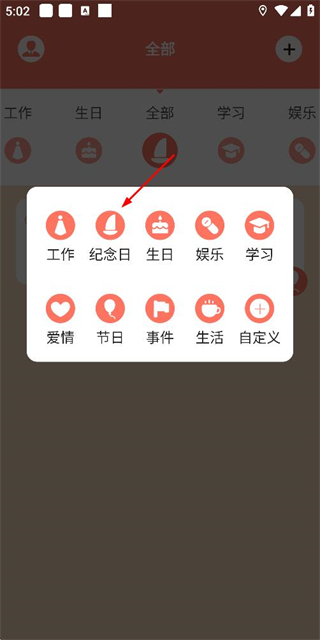 2、在分类选择菜单里点击纪念日选项,即可进入纪念日编辑页面。