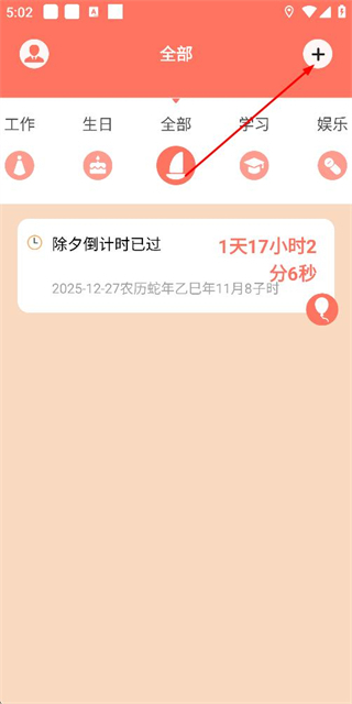 1、在计时应用的首页,点击右上角的加号按钮,此时会弹出分类选择菜单。