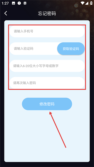 3、进入忘记密码页面后,按顺序输入手机号,获取并填写验证码,设置新密码,最后点击【修改密码】按钮即可完成密码重置。