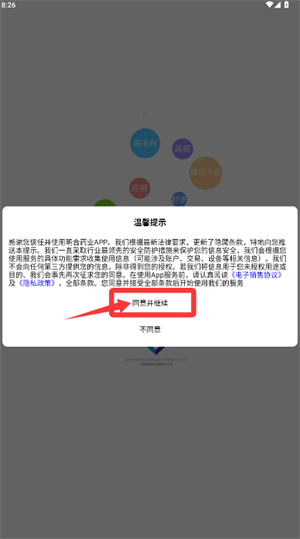 1、打开应用,在弹出的提示窗口中选择“同意并继续”选项,以进入下一步操作。