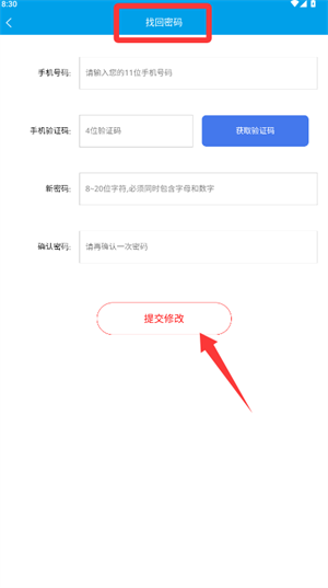 3、要是忘记了密码,可以通过“找回密码”功能,输入手机号等相关信息后提交,就能完成密码修改。