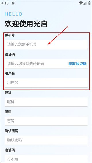 3、进入注册页面后,先填写手机号,获取并填写对应的验证码,之后再填写用户名。