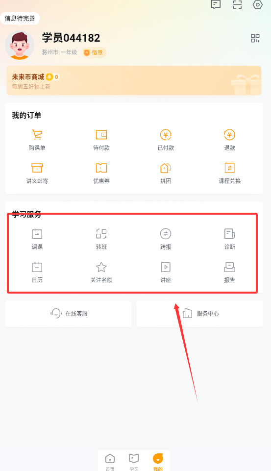 3、在学习服务板块内,您可以根据提供的选项来挑选合适的课程服务,以便更合理地规划和安排更多学习计划。