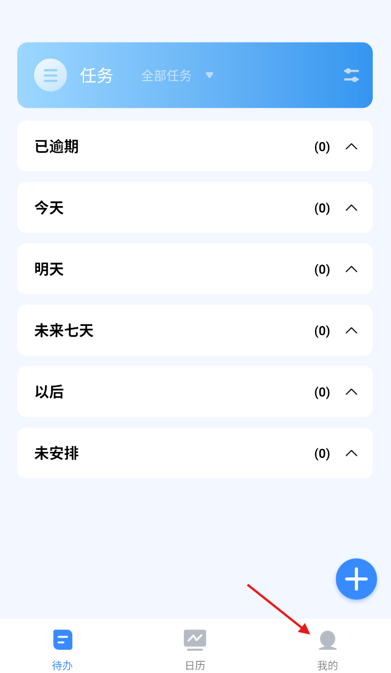 1、打开滴答清单并进入待办页面,轻点底部的“我的”选项,即可进入个人设置界面。