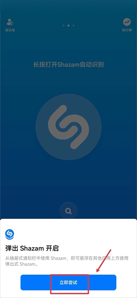4、开启后返回后,会弹出Shazam开启,点击立即尝试
