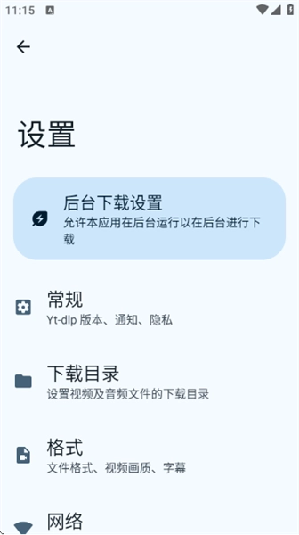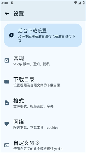 点击左上角的设置图标,即可进入设置界面,在这里能够对后台、常规(包括Yt-dlp版本、通知、隐私)、目录、格式、网络等各项内容进行配置。